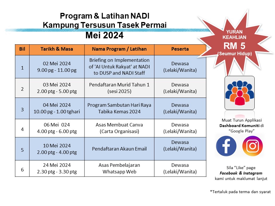 Tarikh : 02 Mei 2024 (Khamis) Masa : 9.00 Pagi – 11.00 Pagi Lokasi : NADI Kg Tersusun Tasek Permai Peserta : Pengurus dan Penolong Pengurus NADI Tujuan : Kelas ini adalah untuk Sesi Briefing on Implementation of ‘AI Untuk Rakyat’ at […]