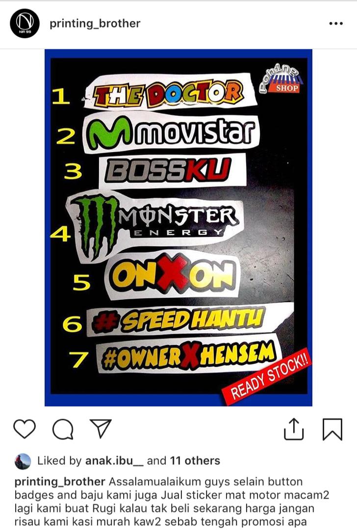 dalam perniagaan menjual sticker-sticker motor dan button. Beliau barangan ini kepada rakan-rakan dan jiran setempat.